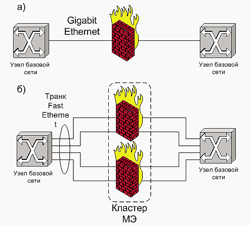 Кроме того, межсетевые экраны в базовой сети можно применять для разных реализаций физических сред: для оптической с использованием протокола Gigabit Ethernet и для транк-соединения на основе технологии Fast Ethernet. В первом случае межсетевые экраны должны иметь два интерфейса поддерживающие высокоскоростную технологию Gigabit Ethernet (см. рис. 3-а). Во втором - необходимо применять кластерные решения для межсетевых экранов, ввиду того, что оптимальным по соотношению «стоимость/пропускная способность» транк-соединением следует считать четырехканальную структуру, за счет чего в режиме полного дуплекса можно достигать пропускной способности в 800 Мбит/с (см. рис. 3-б).