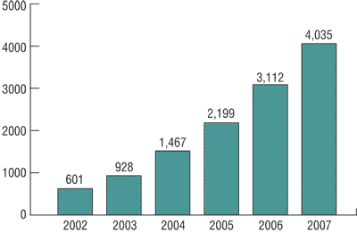 Доходы рынка биометрии в 2002–2007 годах (в миллионах долларов)